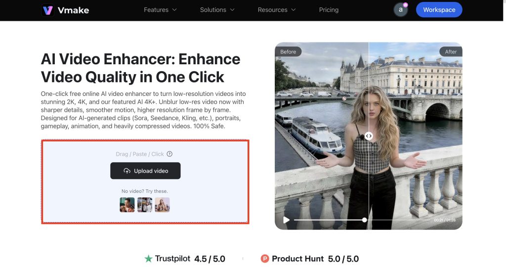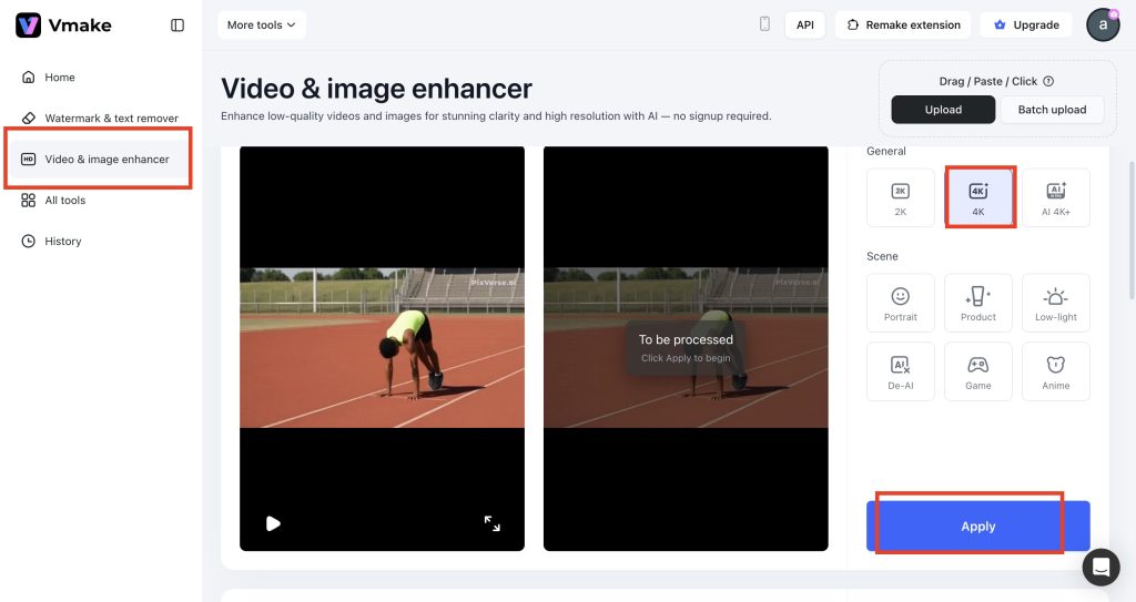 Once you know what’s causing the issues, the next step is fixing them. You don’t need complicated editing software. Vmake AI Video Enhancer can handle most of the work for you. Here’s how you can fix this: