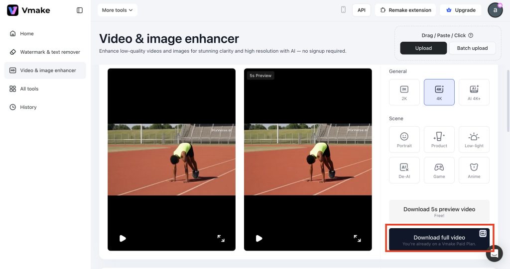 So, that’s all on fixing generative video quality with Vmake video enhancer. All you need to do is just add your videos to the tool and leave the rest to the AI. You can get the best results within a few seconds.